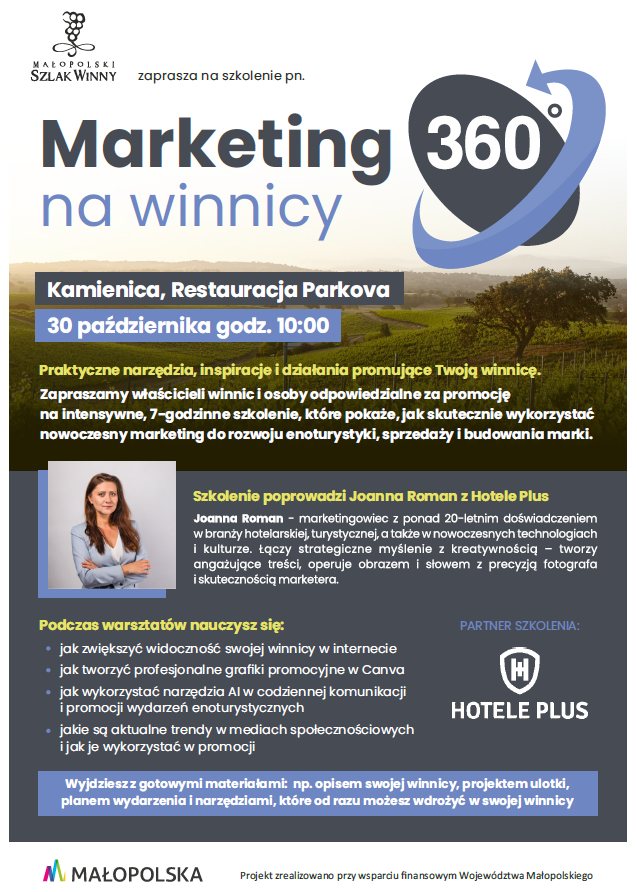 Już 30 października nasza trenerka Joanna Roman poprowadzi wyjątkowe szkolenie „Marketing na winnicy 360°” organizowane przez Małopolski Szlak Winny.